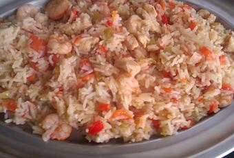 Pochamos los verduras:cebolla, pimientos y zanahoria a fuego lento (salamos)Incorporamos el pollo cortado a tiras, los langostinos pelados, cuando casi esté listo, añadimos el arroz, rehogando todo junto