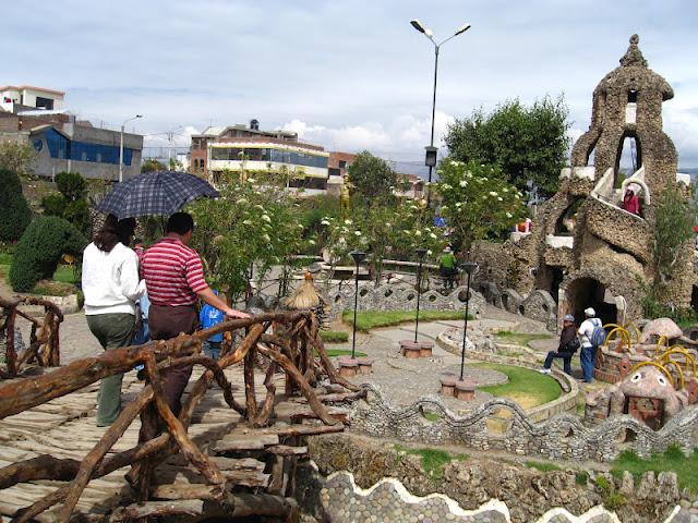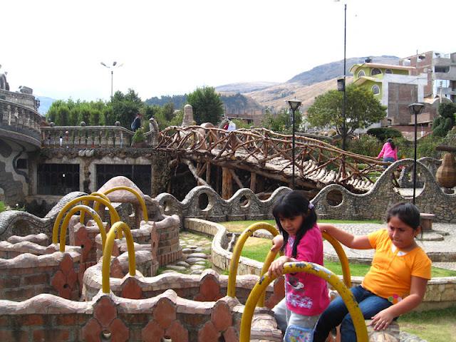 Si vas desde el centro hasta ese lugar un taxi te cobra 4 soles, aproximadamente. Yo ya había visitado este parque cuando regresé desde Huancavelica con un grupo de chicos con los que habíamos ido a obsequiar regalos a los niños de unos pueblos de esa zona (ver entrada aquí) pero el sitio tiene tanto encanto que siempre es bueno repetir la visita. Lugar favorito de los huancaínos, el parque parece haber sido hecho por una especie de “Gaudí andino” puesto que en su construcción apenas si hay líneas rectas; su diseño es laberíntico, de formas sinuosas, como si repitiera el fluir de un río. Hay muchos rincones que aparecen de la nada y donde hay algún monumento a la estatua de algún personaje célebre de la cultura huanca pintado de un color dorado chillón. El sitio es extraordinariamente tranquilo y limpio. Si se quiere pasar una tarde serena mirando como la pasan los huancaínos, éste es el lugar perfecto.