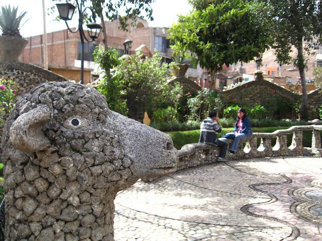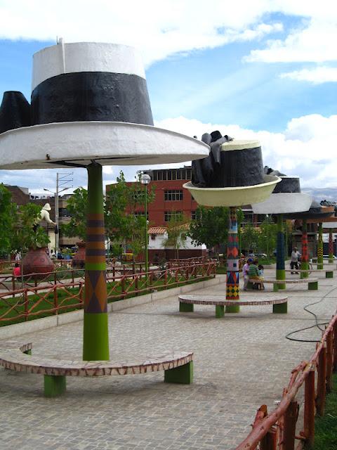 Apenas llegamos a Huancayo, con las posaderas resentidas y los músculos agarrotados, nos estiramos como gatos recién levantados. El coche nos dejó en el paradero de la empresa TRANS MILENIO desde donde siempre parten carros a la zona de la reserva NOR YAUYOS (ver DATOS UTILES abajo). Frente al paradero se ubica el bonito “Parque de los sombreros” al que aprovechamos en visitar pues se veía bastante simpático. En mi opinión Huancayo debe ser la ciudad con parques más bonitos, limpios y originales de los andes peruanos. No los conozco todos pero en los pocos que pude visitar noté esmero en el cuidado e ingenio en el diseño. Se le puede achacar muchas cosas a estos parques como que tienen formas heréticas, no acorde con los cánones del paisajismo occidental, tal vez; que están sobrecargados de colores y ornamentos; que se ha abusado del cemento para construir algunos de sus segmentos pero quizás ese estilo tan, por momentos, excéntrico, es el que le ha dado gracia.