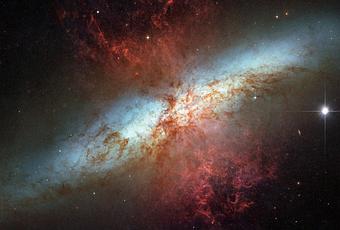 M82 o la galaxia del Cigarro, brilla intensamente en longitudes de onda infrarrojas y es notable por su actividad de formación estelar. La galaxia del Cigarro experimenta interacciones gravitacionales con su vecino galáctico, M81, lo que hace que tenga una tasa extraordinariamente alta de formación estelar: un estallido estelar.