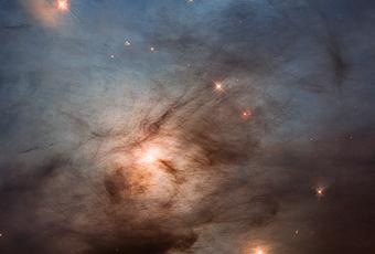 La colorida vista del Hubble, mostrada a través de su capacidad única para obtener imágenes de luz ultravioleta a infrarroja cercana, revela un caldero efervescente de gases brillantes y polvo negro agitado y soplado por varios cientos de estrellas recién formadas incrustadas dentro de la nube oscura. El Hubble solo araña la superficie porque la mayor parte de la tormenta de fuego de nacimiento de estrellas está oculta detrás de nubes de polvo fino, esencialmente hollín, que son más gruesas hacia la parte inferior de la imagen. La negrura en la imagen no es un espacio vacío, sino lleno de polvo oscuro.