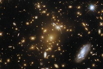 Un vasto cúmulo de galaxias se esconde en el centro de esta imagen del Telescopio Espacial Hubble de la NASA / ESA. Como un monstruo marino sumergido que causa olas en la superficie, este leviatán cósmico puede identificarse por las distorsiones en el espacio-tiempo a su alrededor. La masa del cúmulo ha causado que las imágenes de las galaxias de fondo sean gravitacionales; El cúmulo de galaxias ha causado una curvatura suficiente del espacio-tiempo para doblar el camino de la luz y hacer que las galaxias de fondo aparezcan distorsionadas en rayas y arcos de luz. Una gran cantidad de otras galaxias se pueden ver alrededor del cúmulo, y un puñado de estrellas en primer plano con picos de difracción reveladores están dispersos por toda la imagen.