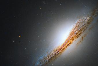 Una llamativa raya naranja y azul llena esta nueva imagen del Telescopio Espacial Hubble de la NASA. Las capacidades visibles e infrarrojas del Hubble capturaron esta vista de borde de la galaxia lenticular NGC 612. Las galaxias lenticulares tienen una protuberancia central y un disco muy parecido a las galaxias espirales, pero carecen de los brazos característicos. Por lo general, tienen poblaciones estelares más viejas y poca formación estelar en curso.