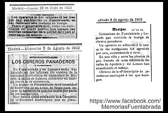 En la primera noticia del jueves 23 de julio de 1903 podemos leer que los operarios de dos de las tres tahonas en Fuenlabrada se han declarado en huelga y tanto el gobernador civil como las autoridades del pueblo han tomado las medidas necesarias para que no falte el pan.