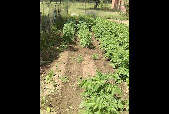 Como habeis podido ver en muchas de las fotos que he publicado durante este tiempo sembramos cinco surcos de patatas, la misma variedad, del mismo saco, cortadas en el mismo momento y sembrado los pedazos al azahar, sin embargo no se si habeis podido apreciar que en los dos primeros surcos hay unas pequeñas faltas, cuatro matas concretamente en cada uno de los dos surcos, pero no son concretamente en la punta ya que tenemos dos nacidas, cuatro faltas y demas sin fallo. Pues cuando ya han pasado mas de dos meses que las sembramos y las otras estan con las flores, ahora comienzan a nacer las ocho patatas que faltaban.