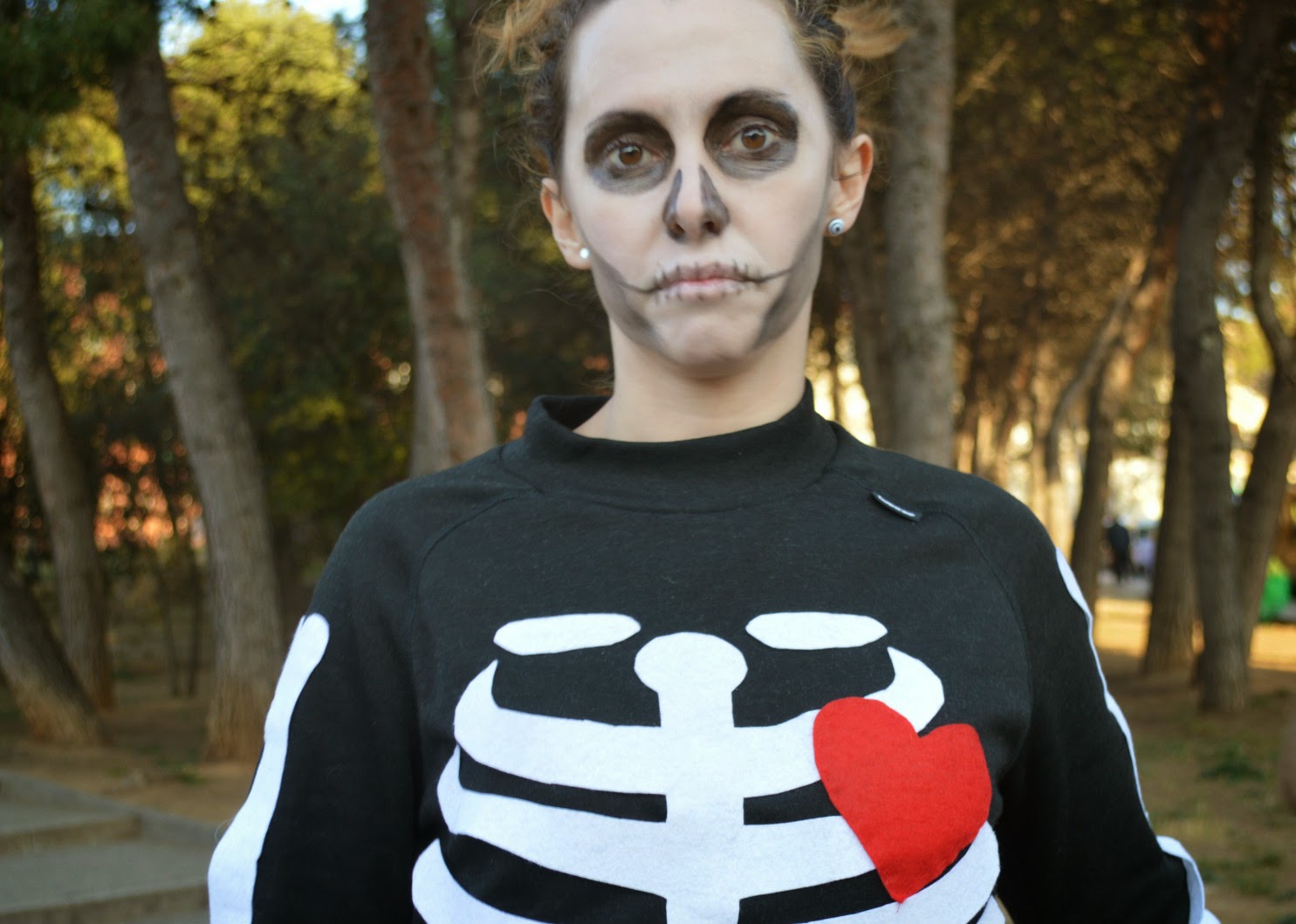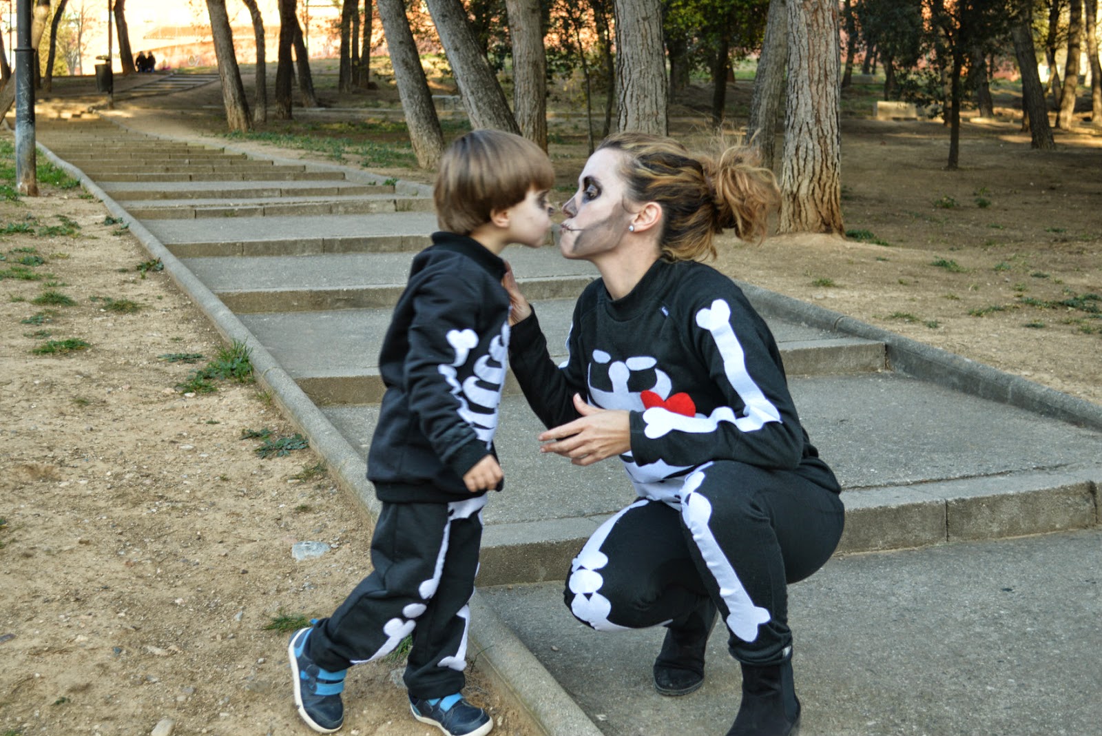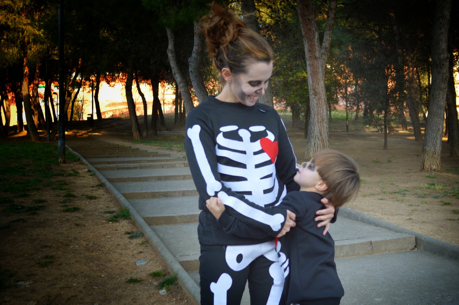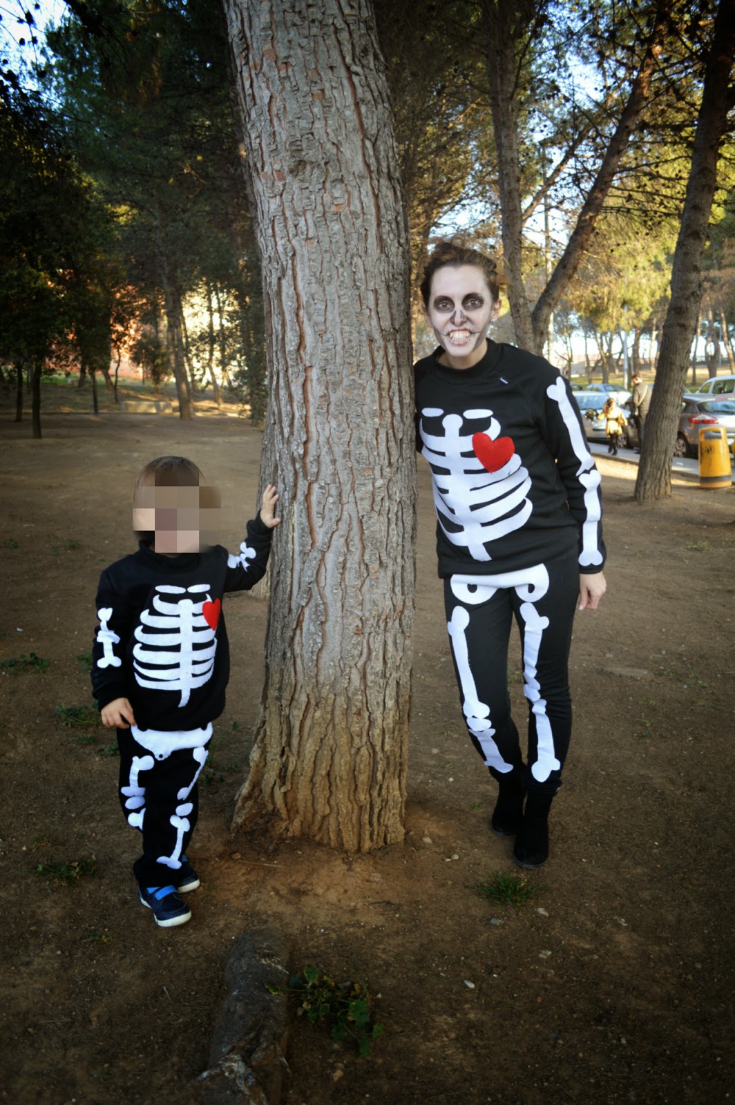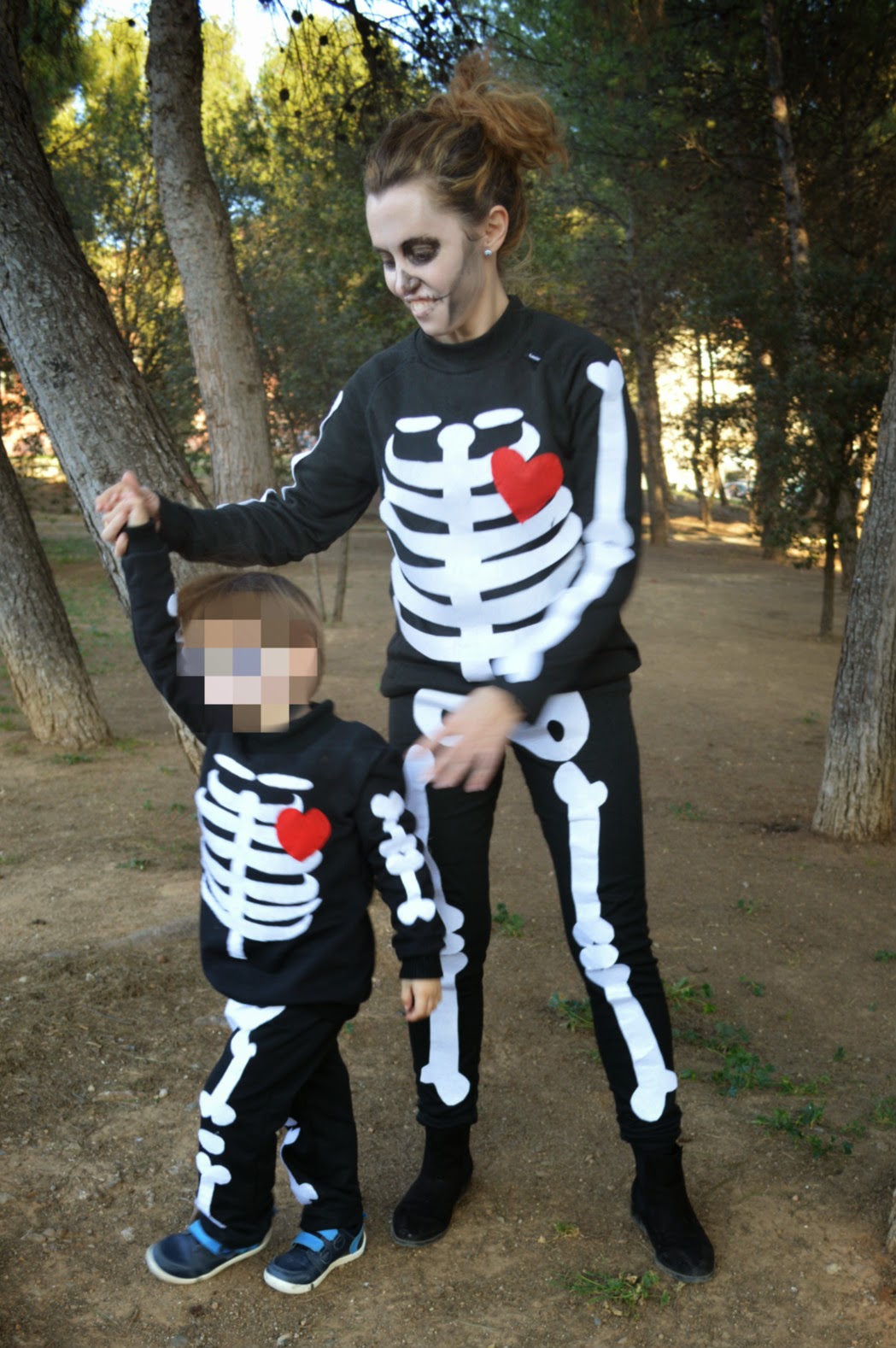 Allá voy. Estos carnavales quería ir igual que mi hijo disfrazado como el año pasado (fuimos de demonios), e intenté que fuéramos de algo cuqui como cupidos, nubes, yo que sé, le di mil propuestas.... y nada le hizo cambiar de opinión, el quería ir de esqueleto, si o si, para tener tres años es un cabezota. Y allí que fuimos de esqueletos. Mis disfraz parecía fácil, tenia un conjunto decatlon todo negro, térmico para cuando vamos a la montaña y la tarea era coserle encima los huesos de fieltro. los hilvané, menudo trabajazo, cuanto hueso! Aquí el resultado: