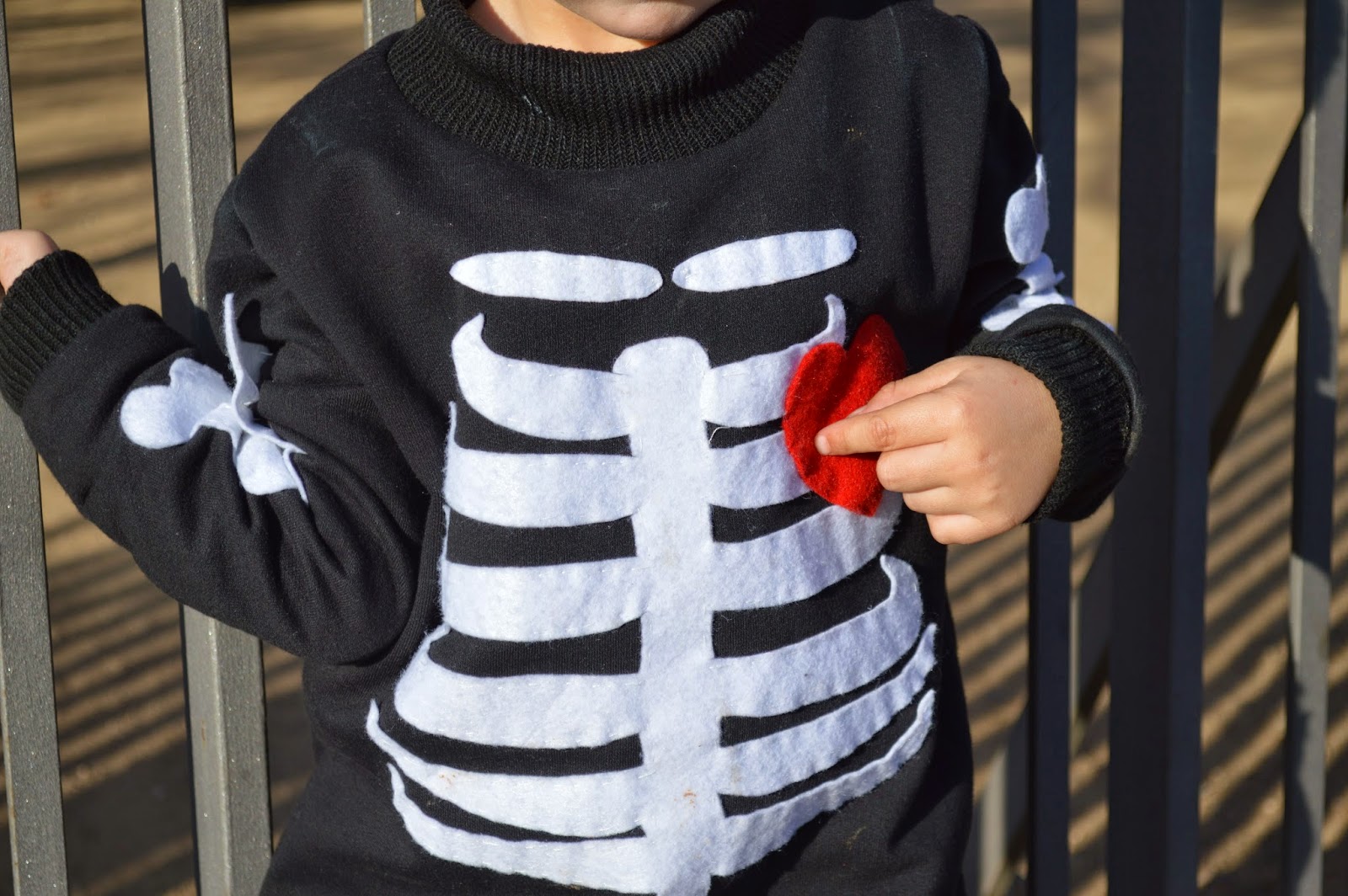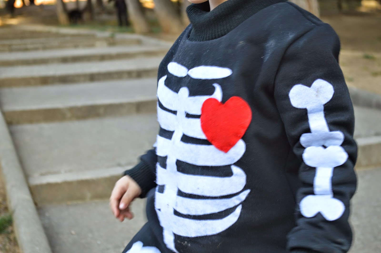 Y el del peque, le hice una sudadera para la parte de arriba, patrón 16 Mushroom de la ottobre 4/2014, sin bolsillos y con puños en cuello y mangas. y le hilvané encima los huesos, menudo trabajazo otra vez, toda la semana cosiendo huesos.Fuimos de esqueletos, pero con corazón. Disfraz muy uVe jijijiji