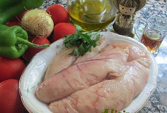 - Huevas de merluza 500 g.- Tomates de pera 1 kg.- Pimientos verdes 1 grande.- Cebollas 1 mediana.- Perejil picado un manojito.- Aceite de oliva 10 cucharadas soperas.- Vinagre de vino 6 cucharadas soperas.- Sal.