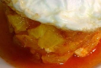 - Lamino los dientes de ajo y los pongo a freír en una sartén con abundante aceite. Cuando empiecen a tostarse, no deben quemarse pues amargaría el aceite, los retiro con una espumadera y los pongo junto a la naranja y 3 cucharadas soperas del aceite donde los hemos frito. Remuevo todo e integro