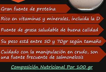 El huevo un alimento muy completo y se debe incluir en una dieta equilibrada.Rico en antioxidantes como los carotenoides, el selenio, la vitamina E, ácido fólico o vitamina B9 y colina.. Ácidos grasos principalmente monoinsaturado como ácido oleico, linoleico, también poliinsaturados como los omega3 y proteína de alto valor biológico.Hay muchos estudios como el del International Journal of Cardiology 2005 demostrando que tomar un huevo diario en personas sanas no aumenta el colesterol "malo" ni el riesgo de padecer enfermedades cardiovasculares.Se pueden clasificar por su peso dividiéndose en las siguientes categorías: