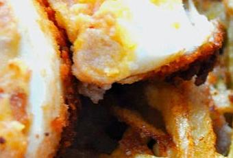 INGREDIENTES:-4 huevos cocidos-100 gr bacon en trocitos-un trocito de cebolla-dos cucharadas de leche-huevo batido y pan rallado para empanar