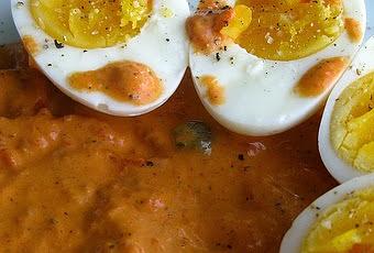 Tomamos los huevos y cortar cada uno a la mitad. Los colocamos en una fuente con la yema hacia arriba y encima vertimos la salsa anteriormente preparada.