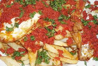 Preparación:Se pelan las papas y se parten. Se pone la sartén al fuego, se deja calentar y se fríen las papas. Se reservan en la bandeja que se van a servir. Se fríen los huevos y se van depositando encima de las papas.
