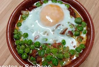INGREDIENTES:( Para 6 platitos de 12 cm. de diámetro)- 500 gr Guisantes frescos, desenvainados (preferiblemente frescos)- Huevos- 1 cebolla- 3 dientes ajo- Sofrito de tomate- 2 hojas de laurel-50 gr. de jamón serrano en trocios pequeños- 80 gr chorizo ibérico- Aceite de oliva- Sal