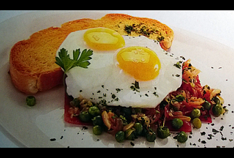 - Poner sobre cada uno de los platos una lonja grillada de jamón cocido, sobre éste las arvejas salteadas con cebolla y terminar coronando con los huevos fritos. Salpimentar y acompañar con rodajas de pan de campo.
