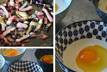 Precalentamos el horno a 200ºC calor arriba y abajo sin ventilador, mientras en una sartén añadimos un chorrito de aceite y saltamos los champiñones, el jamón y el panceta cortado todo en tiras previamente. Cocinamos todo durante 2 minutos, a continuación en unas tacitas añadimos una cucharada rasa de crema de queso y con el dorso de la cuchara alisamos para echar a continuación los huevos. Añadimos despacio un chorro generoso de nata sin cubrir la yema, en un lateral echamos un poco de la mezcla de champiñones, panceta y jamón, por ultimo en el lateral contrario añadimos un poco de queso gruyer rayado. Introducimos en el horno 10 minutos aproximadamente, estarán listos tan pronto como la clara este cuajada. Retiramos y acompañar con un buen trozo de pan, para poder mojar :P