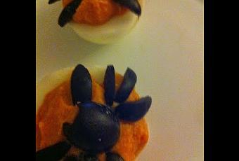 - Para hacer el cuerpo de las arañas, parte una aceituna por la mitad, y para las patas corta la aceituna en ocho trozos y decora el huevo.