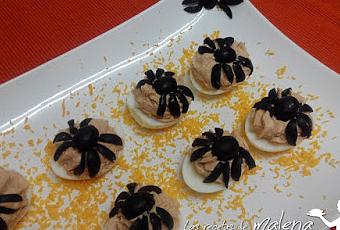 Cocemos los huevos en agua hirviendo durante diez minutos. Refrescamos en agua, los pelamos y los cortamos longitudinalmente. Separamos las yemas. Para el paté de sardinas comenzamos retirando la cola a las sardinas. En el vaso de la batidora ponemos las sardinas con el aceite incluido, la crema de queso, el tomate y dos yemas. Las otras dos yemas las reservamos para la decoración. Trituramos hasta obtener una masa homogénea. Ponemos el paté en una manga pastelera - esto es opcional, así podéis rellenar los huevos más fácilmente- Rellenamos los huevos haciendo montoncitos con la manga pastelera o con una cuchara, como nos parezca mejor.Escurrimos el agua de las aceitunas y las partimos longitudinalmente por la mitad. Reservamos parte y el resto las cortamos para hacer las "patas" de las arañas. En una fuente rallamos las yemas que teníamos reservadas, ponemos por encima los huevos y sobre cada uno ponemos media aceituna con cuatro patas de cada lado.