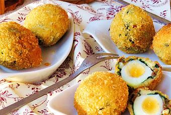 En un principio se puede pensar que son unos huevos empanados, pero la "gracia" es que al partirlos ves que tiene una capa que los recubre, son espinacas, también lleva un par de ingredientes más.
