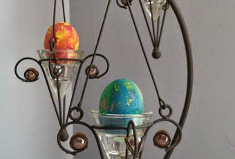 Hoy, os enseño los huevos de Pascua, que pintaron las peques de la casa, la Semana Santa del año pasado (que hizo malísimo). Vaciamos los huevos haciendo un pequeño agujero, pinceles y temperas y a pintar. Usamos este candelabro sustituyendo las velas por los huevos y quedaron así de chulos.