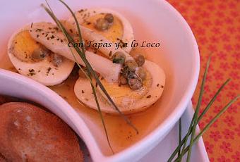 Ponemos los huevos a cocer, una vez cocidos los pelamos y reservamos. En una cazuela ponemos aceite, doramos el diente de ajo laminado un poquitin, agregamos el vino blanco y seguidamente la cerveza, dejamos hervir unos minutos y vamos colocando los huevos cortados a la mitad. Colocamos los espárragos y agregamos los guisantes. Cortamos el cebollino y los agregamos por encima con el perejil. Dejaremos unas ramitas de cebollino para decorar. Eso es todo amigos!!!!