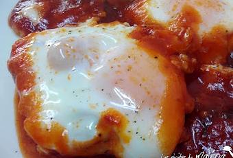 - 2 huevos por persona- 4 tomates maduros- 1 cebolla - 3 dientes de ajo- 2 cucharadas de aceite de oliva- 2 hojas de laurel- una pizca de azúcar- orégano seco- perejil fresco- 2 cucharadas de aceite de oliva- sal y pimienta