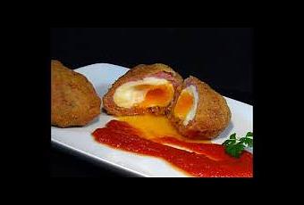 Consiste en un plato en el que se sirve frío un huevo duro al que se le ha quitado la cáscara y se le ha recubierto en una mezcla de salchichas picadas finamente, recubierto de pan rallado, y puesto a freír. El plato fue inventado en la tienda londinense Fortnum & Mason, en el año 1738.[1] Contrario a la creencia popular no es un plato originario de Escocia. Los huevos a la escocesa se suelen servir fríos, acompañando por regla general a una ensalada y relish.