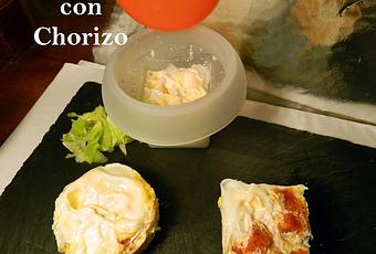 Pincelamos con aceite los recipientes, ponemos el chocizo picado, el huevo, sal y una pizca de pimienta. 30sg potencia 550w, otros 30sg. dejamos reposar unos segundos y comprobamos que ya están listos.