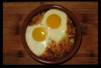 Elaboración: Lo primero que hacemos es el sofrito, echamos un chorro de aceite en una sartén, partimos los pimientos, la cebolla y el ajo en trozos pequeños y los añadimos. Lo dejamos pochar durante diez minutos. Salamos y lo colocamos en unas cacerolas de barro, encima echamos el pan tostado, el queso mozzarella y los huevos. Salpimentamos.