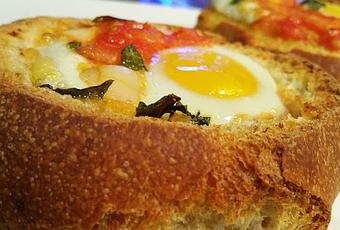 Estos HUEVOS NAPOLEÓN tienen su historia y es que el señor BONAPARTE, en su trabajo de conquistar el mundo, no quería perder el tiempo en la comida. Necesitaba algo fácil y rápido de preparar, así los cocineros con pocos ingredientes y en poco tiempo elaboraron esta rica receta con tan curioso nombre.INGREDIENTES:1 pan de campo redondo2 huevos1 pimiento rojo 1 pimiento verde100 gr de baconPerejil o la especia que más nos gusteSalAceiteMozzarellaELABORACIÓN: