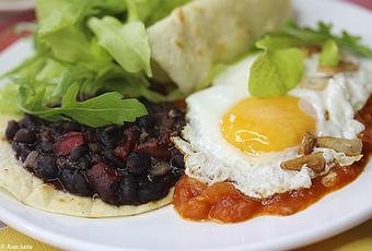 - Hacer uno o dos huevos fritos por persona, servir con la salsa de tomate, las alubias negras y las tortillas. Decorar con hojas de lechuga o hacer una buena ensalada para acompañar.