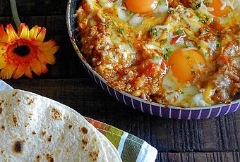 Hace unos días tenia intención de preparar unos huevos rancheros con sus correspondientes tortillas de trigo, pero haciendo memoria recordé que hacía muchos años, en un restaurante mexicano que había en Lleida, que ya no está (yo lo hecho de menos) mi plato preferido era una especie de cazuelita con huevos, carne, queso... que se acompañaba con las tortitas y estaba taaaaaan rico!! tu te preparabas tus rollitos y a disfrutar!!
