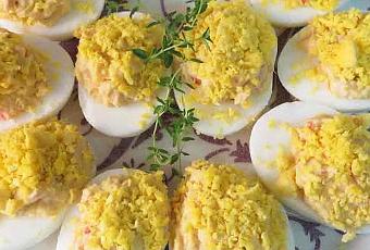 En un bol ponemos las yemas y las chafamos con un tenedor, añadimos medio envase de Bocadelia cangrejo, una cucharada de mayonesa y la lata de atún bien escurrido y desmenuzado. Mezclamos y rellenamos las mitades de huevo.