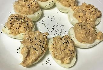 - 4 huevos (preferiblemente de tamaño L)- 1 lata de atún - 4 cucharadas de mayonesa- 1 cucharada de ketchup (también se puede de tomate frito)- perejil en polvo.