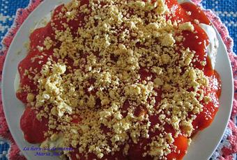 Tomamos las yemas reservadas y las desmenuzamos con un rallador o con las manos, las ponemos por encima del tomate.