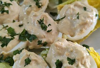 Hacemos la mayonesa como tengamos costumbre (incluso añadiéndole un diente de ajo si nos gusta), cuando haya espesado le añadimos una latita de atún. Mezclamos con las yemas y el aguacate y rellenamos las claras.