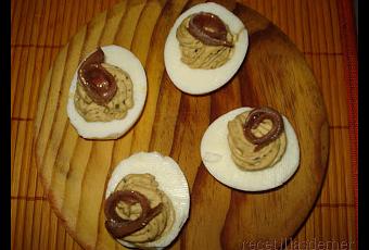 Comenzamos cociendo los huevos en agua con sal durante diez minutos. Cuando se enfríen, pelar y abrir por la mitad vaciando la yema en un cuenco.