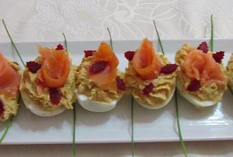 Echamos la pasta en una manga pastelera, con boquilla rizada, y rellenamos los huevos, enrollamos las tiras de salmón en forma de flor, y decoramos con unas hojas de remolacha cocida.