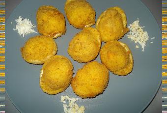 Pelar los huevos y cortarlos por la mitad longitudinalmente. Vaciar la yema y ponerla en un bol junto con las gambas y la bechamel. Mezclar todo muy bien. Rellenar los huevos con esta mezcla. Pasar por huevo y luego pan rallado y freir en abundante aceite caliente. Nota: Aguantan perfectamente en la nevera para el dia siguiente.