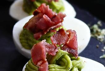 - Cortamos los huevos por la mitad y reservamos la yema. Rellenamos con la ayuda de una manga o con una cucharita y decoramos con el bacon crujiente.
