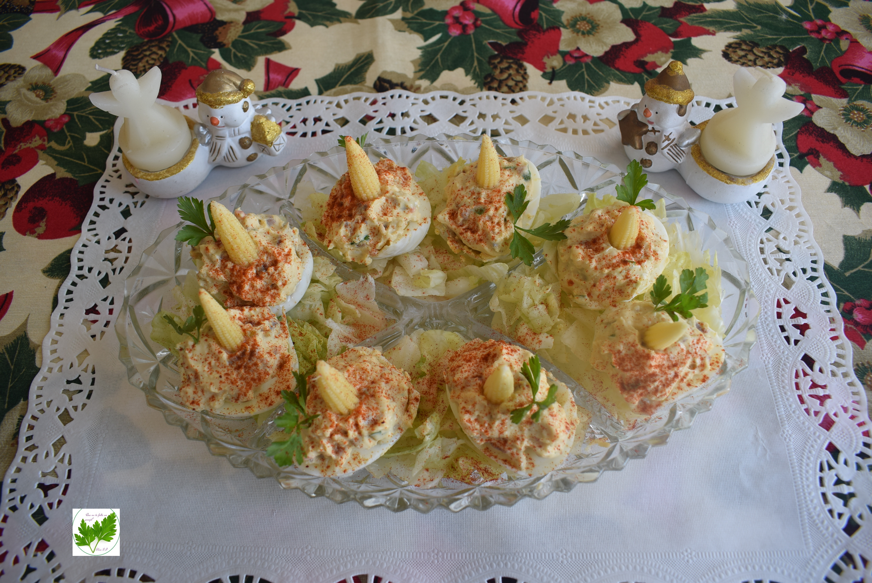 huevos rellenos de atún, surimi, piquillos y aceitunas