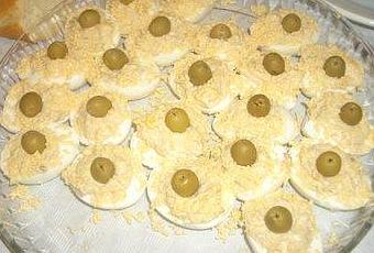 •1 lata pequeña de atún •6 cucharadas de mayonesa•2 aceitunas para adornarPreparación:Se cuecen los huevos y se dejan enfriar. Cuando estén fríos se parten por la mitad sacando con cuidado las yemas.Ponemos las yemas en un plato, añadimos el atún y lo aplastamos para mezclárlos. Añadimos parte de la salsa mayonesa y revolvemos.Con ayuda de cuchara vamos rellenando los medios huevos con el preparado, ponemos por encima otro poco de salsa mayonesa y adornamos con media aceituna.