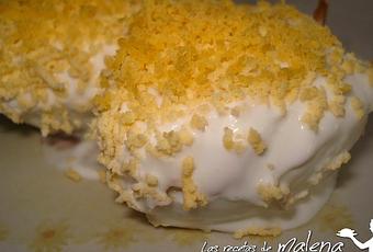 Mezclamos el atún con una cucharada de mayonesa y con las yemas. Aplastamos todo con un tenedor. Rellenamos las claras de huevo con este preparado y las vamos colocando en la fuente de presentación.Extendemos la mayonesa con cuidado por encima de los huevos para que queden todos cubiertos. Pasamos las dos yemas que teníamos reservadas por un rallador por encima de la mayonesa cubriendo toda la superficie. Puede adornarse con unas tiras de pimiento morrón o del piquillo o bien con unas aceitunas.Metemos en el frigorífico y servimos muy frío.