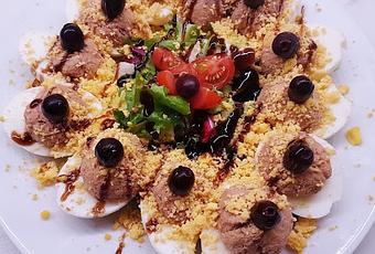 2.- Partimos los huevos en dos mitades. Con cuidado le quitamos la yema.(Reservamos 2 yemas para el final) Escurrimos las latas de atún, en un bol mezclamos el atún con las yemas de huevo y la salsa ketchup. Aplastamos todo bien con la ayuda de un tenedor.3.- A continuación, formamos una bolas con la mezcla de atún y huevo. Rellenamos cada mitad del huevo con la bola, disponemos los huevos en un plato. Decoramos cada huevo con una aceituna. Servimos con un poco de brotes verdes de ensalada en el centro, el tomate partido por la mitad. Rociamos con el aceite de oliva, las yemas de huevos picadas finamente y la crema balsámica.