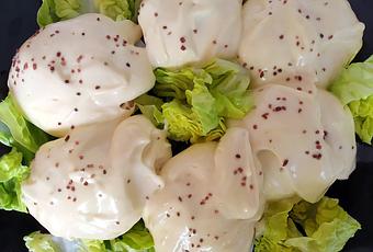 Colocarlos en el plato de presentación, cubriendo generosamente con la mayonesa, decorando con la lechuga troceada y espolvoreando con la sal Kala Namak.