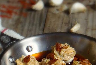 INGREDIENTES6 huevos cocidos250 gr. de migas de bacalao desaladas1 cebolla pequeña100 ml. de nata4 dientes de ajoaceite de oliva virgen extra DOUROLIVA1 cucharadita de pimentón dulcesal