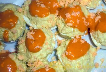 Pelamos los huevos, los cortamos por la mitad, retiramos las yemas y las dejamos en espera. Rellenamos los huevos con la brandada.