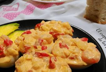 HUEVOS RELLENOS DE GAMBAS Y MANGO (con mayonesa de miel y mostaza):