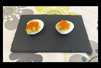 Hoy os traemos una receta súper fácil que os va a sorprender, tanto por su presentación, ya que el caviar llama mucho la atención, como por su sabor, porque la mezcla con el guacamole es espectacular.Ingredientes:- 4 huevos- 4 cucharadas de guacamole casero (puedes ver la receta aquí)- 4 cucharaditas de caviar de salmón de Zarendom- SalReceta:- Cuece los huevos en agua hirviendo con sal durante 10 minutos.- Prepara el guacamole casero según la receta del enlace. La única variación que hemos hecho es que, esta vez, lo hemos batido todo bien para que quede una crema homogénea y sin trocitos.- Cuando estén los huevos cocidos, pélalos y córtalos por la mitad.- Separa las yemas de las claras.- Coloca las yemas en un bol pequeño y aplástalas con un tenedor hasta que se deshagan.- Mezcla las yemas con el guacamole hasta que se integren bien.- Rellena la clara de los huevos con el guacamole y las yemas.- Coloca una cucharadita de caviar de salmón por encima.