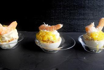 Ingredientes para 4 pax:5 huevos10 langostinos grandes cocidos y pelados150 g de mayonesa ligera2 cucharadas de sofrito de tomate caseroPerejil picadoEneldo picado1 cucharadita de mostaza de DijónPara cocer los huevos:AguaUn chorrito de vinagreUn puñado de salElaboración:Poner a cocer los huevos en un cazo bien cubiertos con agua. Añadir un chorrito de vinagre y un puñado de sal. Cocer 10 minutos desde que empieza la ebullición. Escurrir y refrescar con agua fría. Pelar los huevos (los hago rodar un poco por la encimera, doy unos golpes en los extremos para romper la cáscara).Una vez pelados, se parten por la mitad, se reservan las yemas que se quitaran con una cucharilla y con cuidado de no romper los huevos.